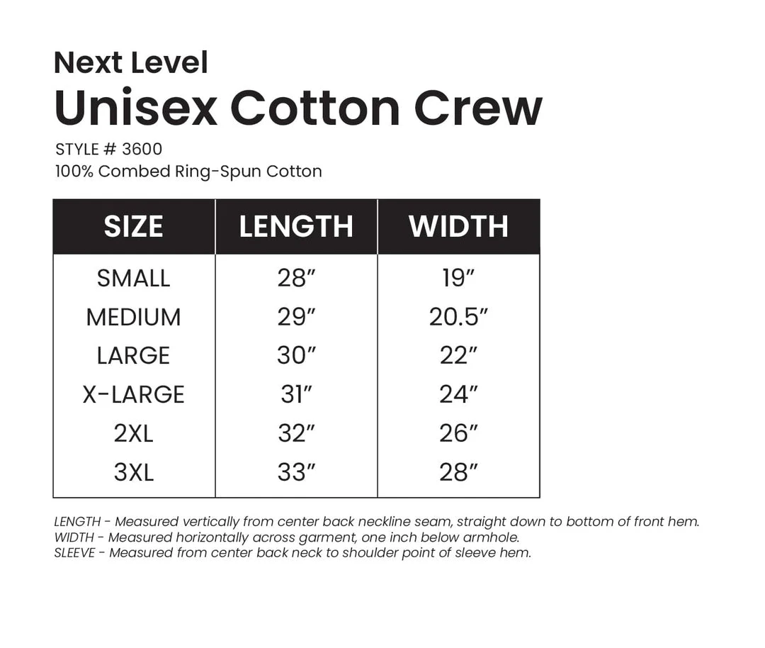 Printed by Impact Merchandisingon Next Level 3600 cream 100% cotton tees with printed interior label. Available in unisex cut sizes XS-4XL.