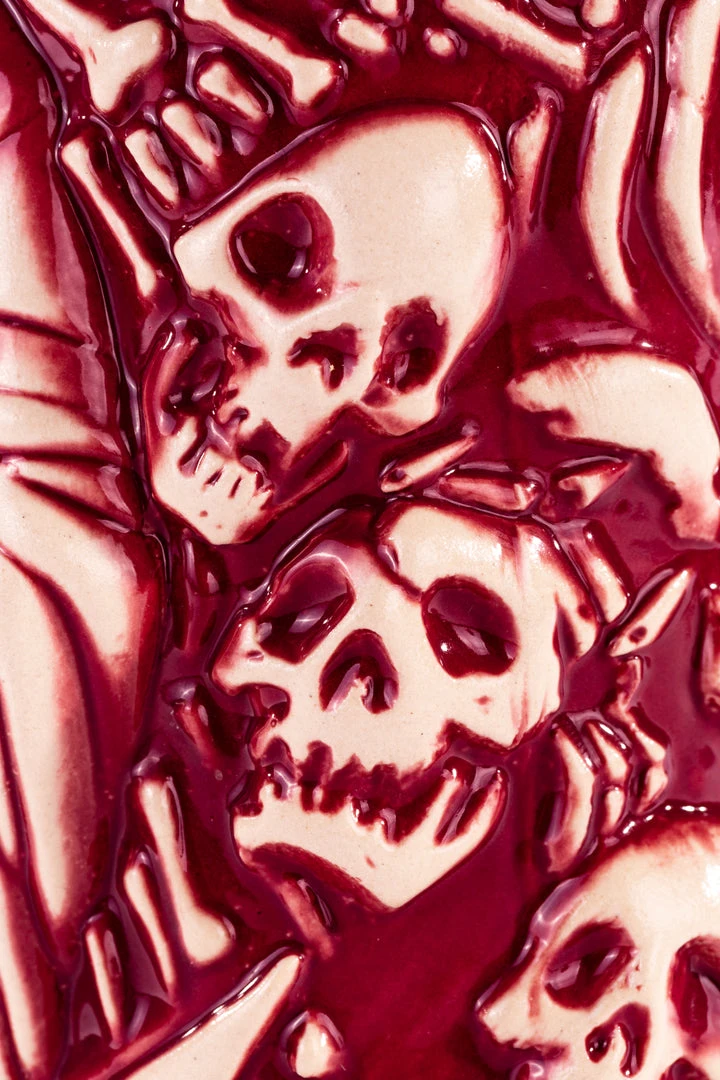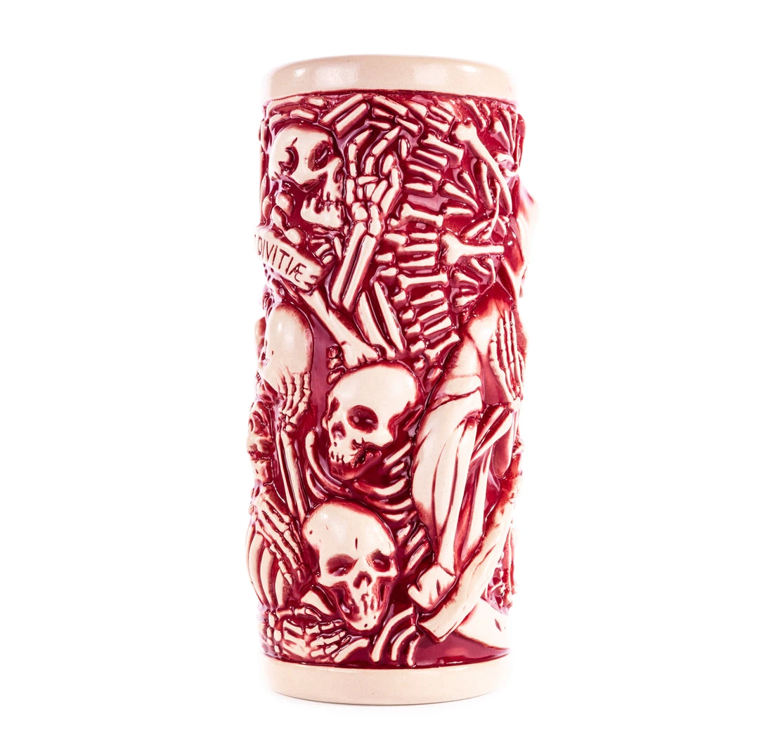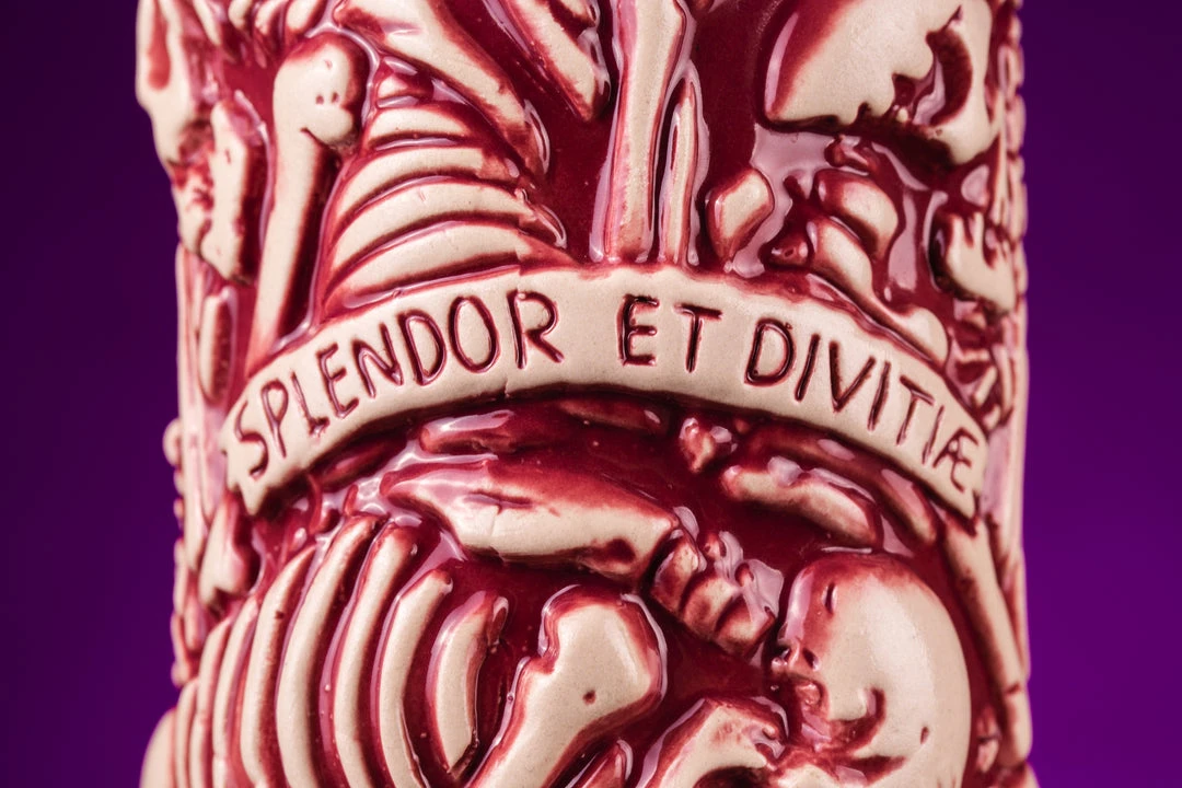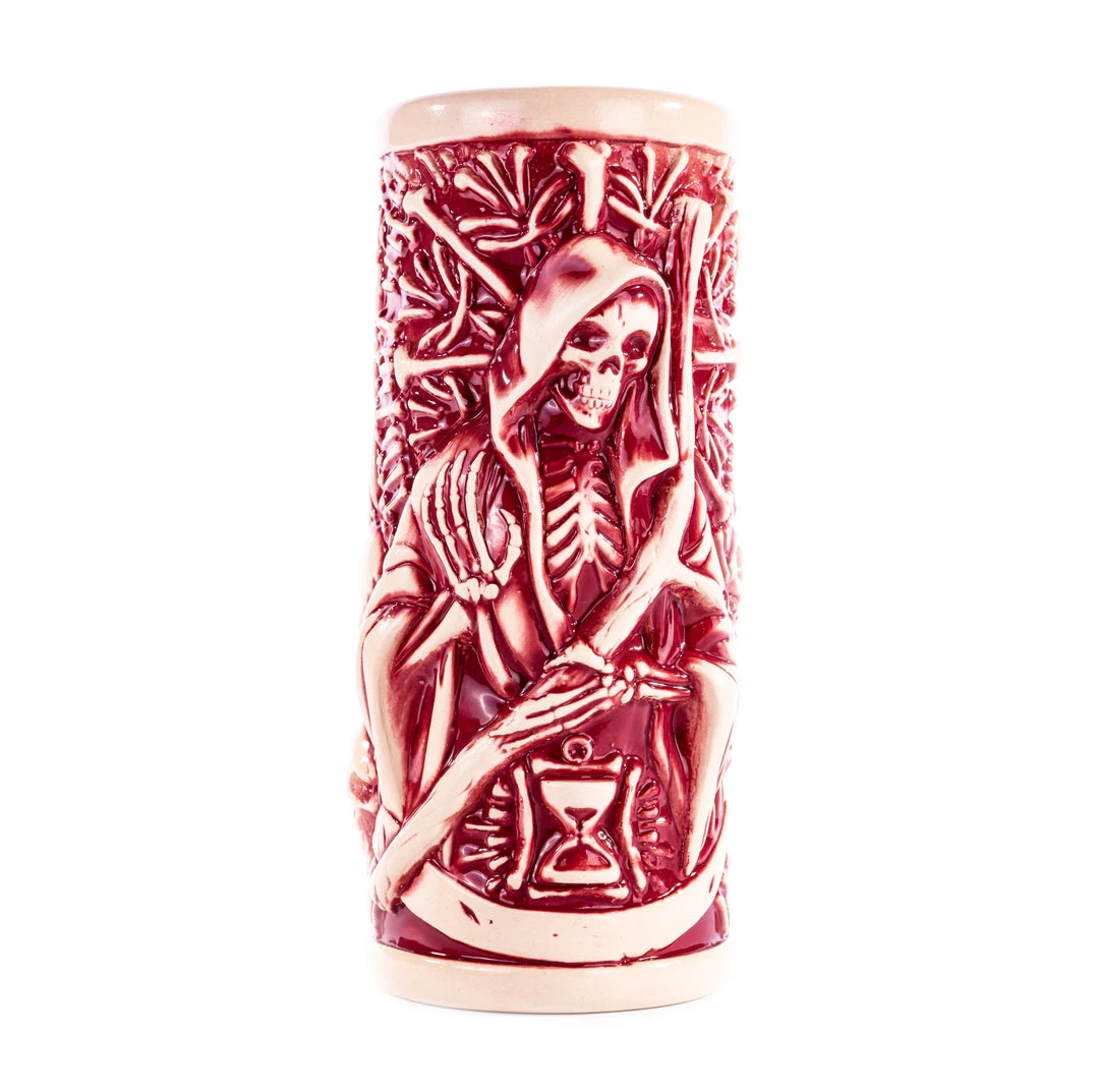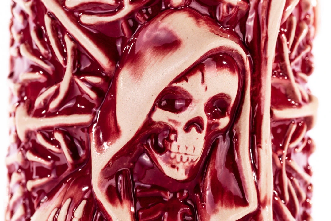 Continuing our Designer Series of tiki mugs, we asked artist Becky Cloonan to come up with a design, and our only request was “something with a Grim Reaper.” And she delivered- big time! Splendor & Riches Designer Series Tiki Mug- something like a cross between a Catholic candle and something from the Sediec Ossuary, is sculpted by Tufan Sezer & Mike Bonanno, and produced by our friends at Tiki Farm, stands approx. 7.” tall, and holds 22oz . The Exsanguine version of Splendor and Riches features a white glaze base, with a red wipe.