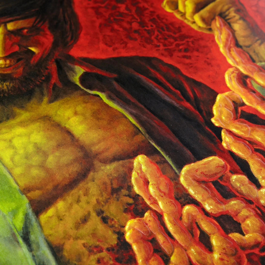 A pseudo-sequel to ANTHROPOPHAGUS, ABSURD reunited D’Amato with star George Eastman, and brought the action from Greece to America, where the near-invincible Mikos escapes from a hospital to go on another exceptionally gory killing spree. Using drills, band saws, axes, scissors, and even an oven, Mikos terrorizes the kids of an Italian American family, until he gets his inevitable comeuppance courtesy of a well placed drawing compass.