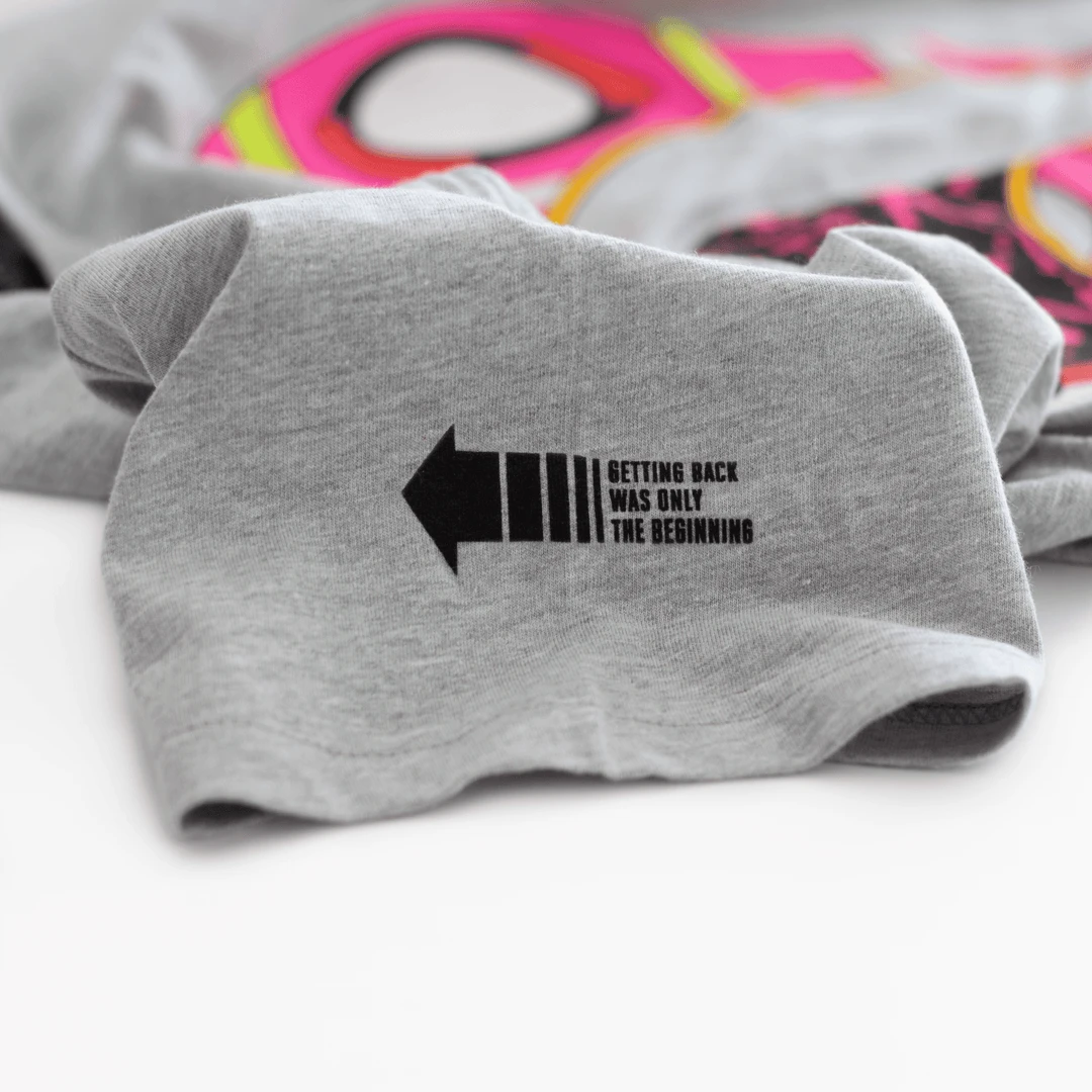 Printed by Impact Merchandising on Bella + Canvas 3001 Heathered Grey cotton tees with printed interior label.