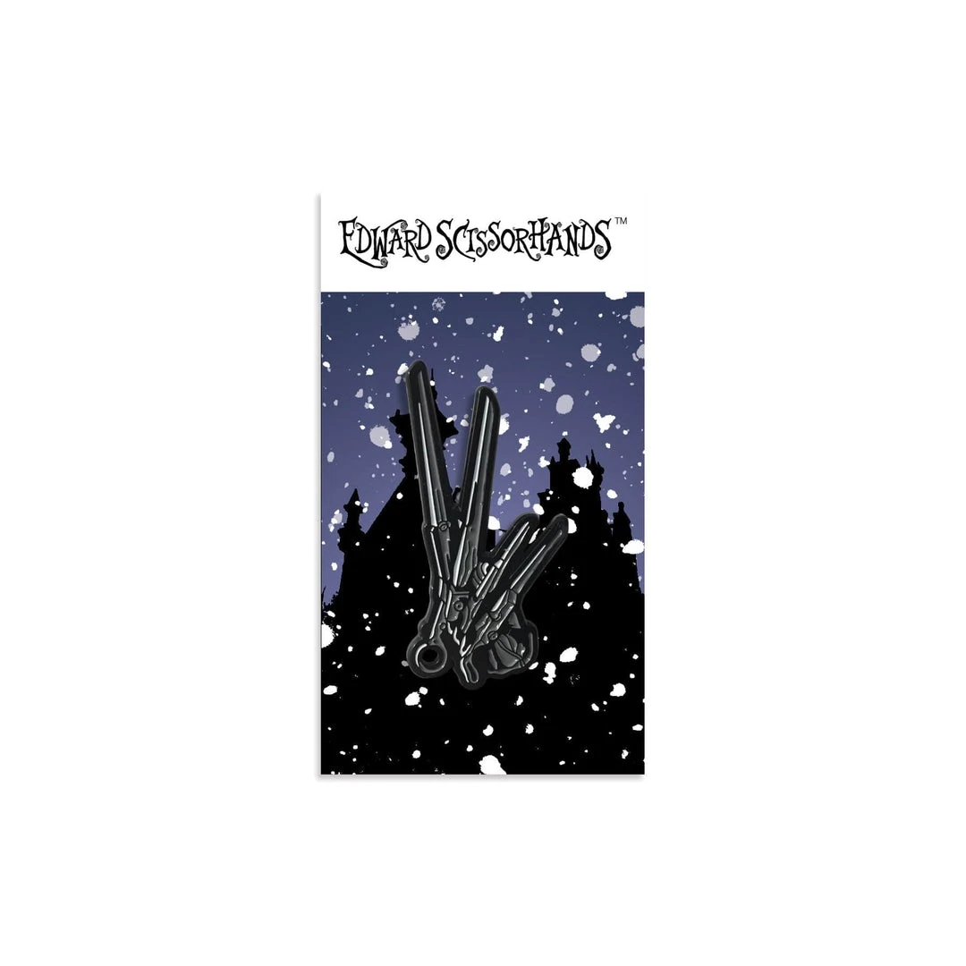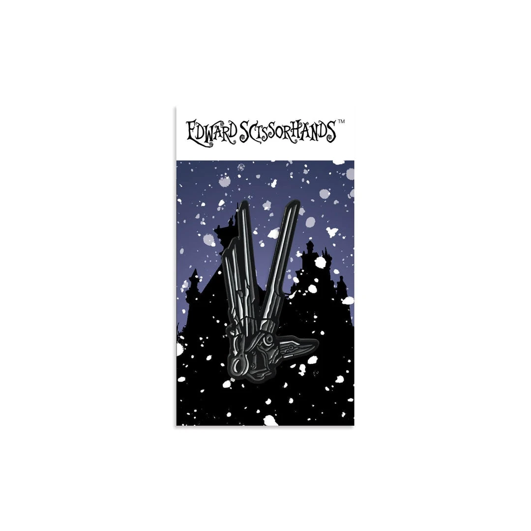 Soft enamel pin with butterfly clutch backing and individually affixed to the Edward Scissorhands packaging.