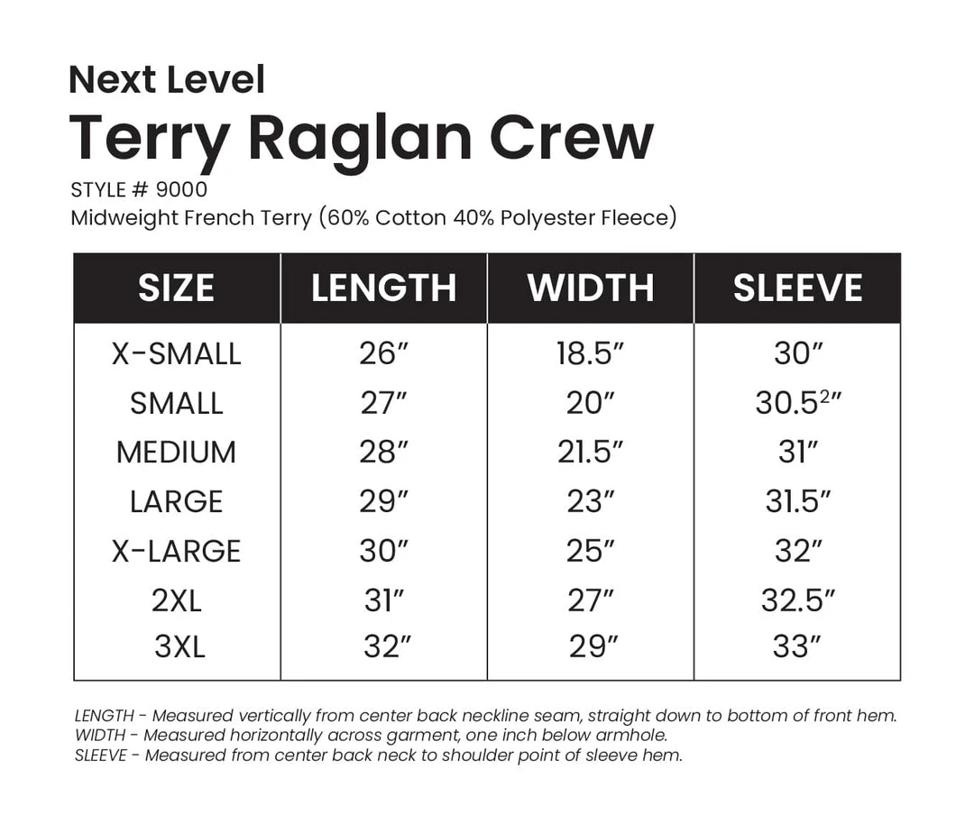 Printed by Impact Merchandising on a Midnight Navy Next Level terry raglan midweight crew neck sweatshirt. Includes a sewn-in silk neck label.