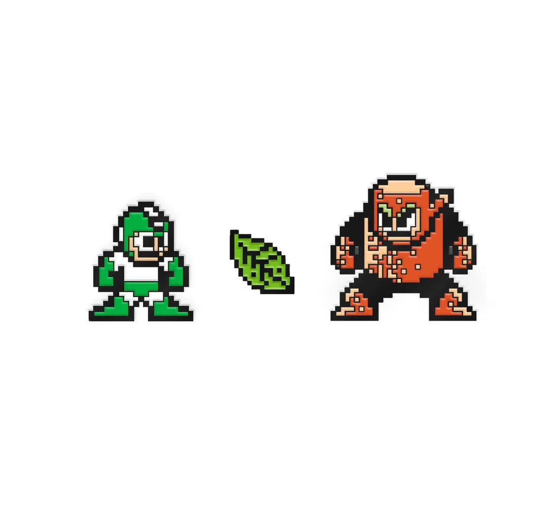Enamel Pin Set. Contains Wood Man enamel pin, Leaf Shield Mega Man enamel pin and a bonus Leaf Shield enamel pin.