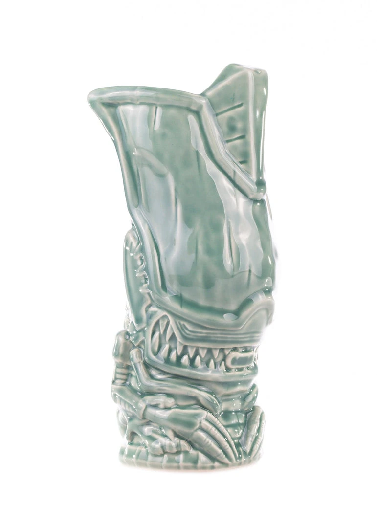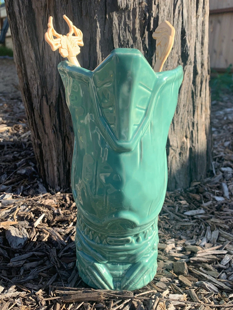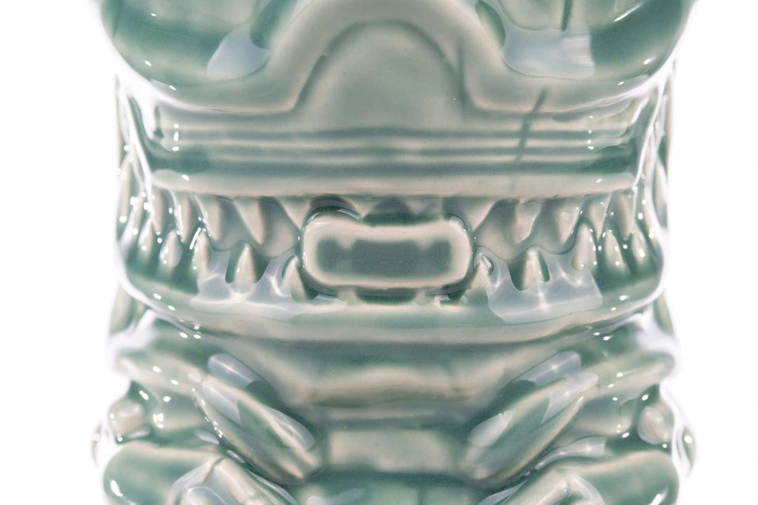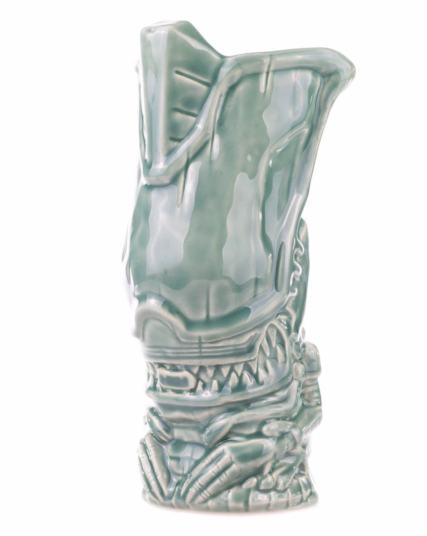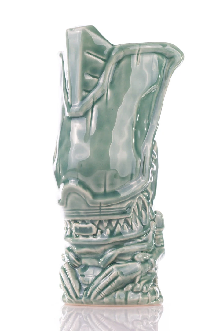 A jade green Acid Blood Variant of our Alien Queen Tiki, a handmade 22-ounce ceramic mug inspired by both Tiki culture and James Cameron’s ALIENS. The set includes two swizzle sticks – a Facehugger and a Chestburster.