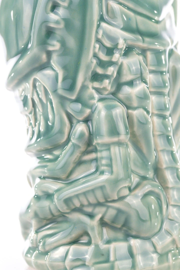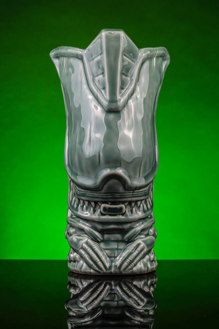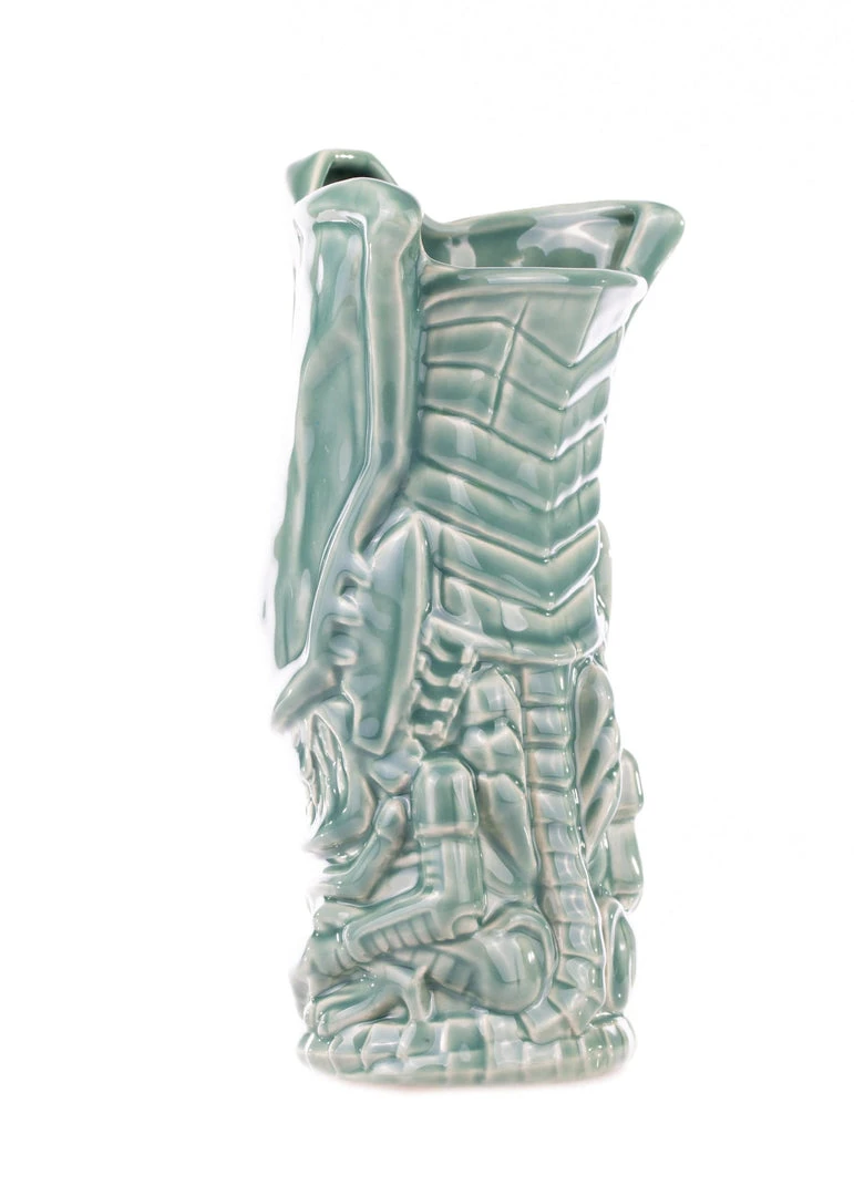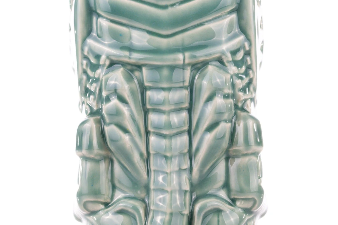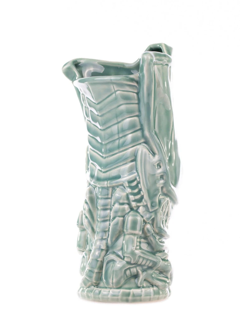 A jade green Acid Blood Variant of our Alien Queen Tiki, a handmade 22-ounce ceramic mug inspired by both Tiki culture and James Cameron’s ALIENS. The set includes two swizzle sticks – a Facehugger and a Chestburster.