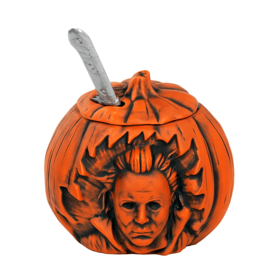 From the slasher classic Halloween comes our tiki mug, inspired by the jack-o-lantern from the opening credits, and featuring a “carved” Michael Myers on the back. Complete with removable pumpkin lid, THREE Slasher Swizzle Sticks and holds approx 17oz.Β Designed by: Mike Bonanno, Sculpted by: Tufan Sezer and Kristin Rousseau and Manufactured by Tiki Farm.
