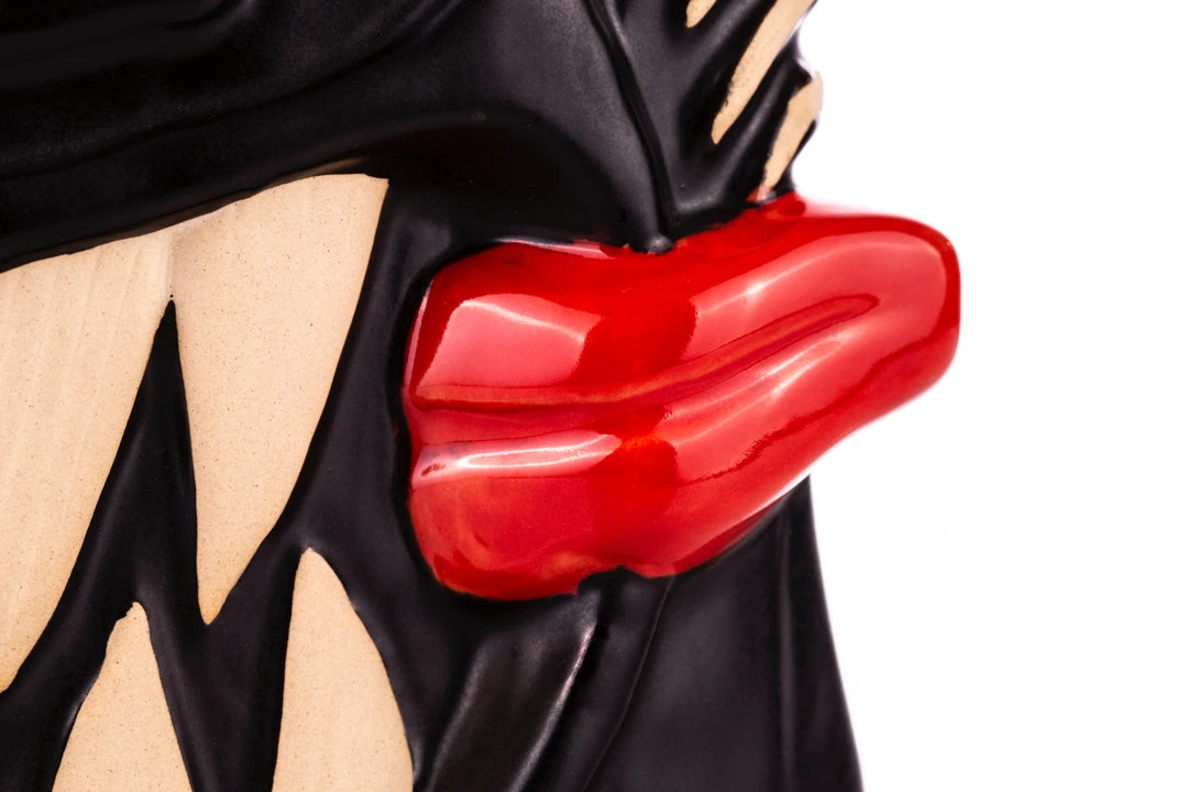 This regular edition of the Venom Tiki Mug features a matte black glaze, with exposed eyes, teeth, and back symbol, and red glaze tongue!