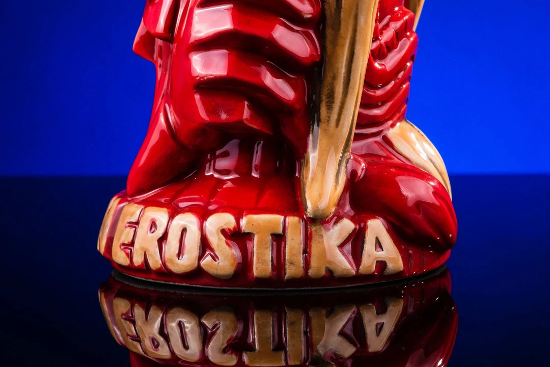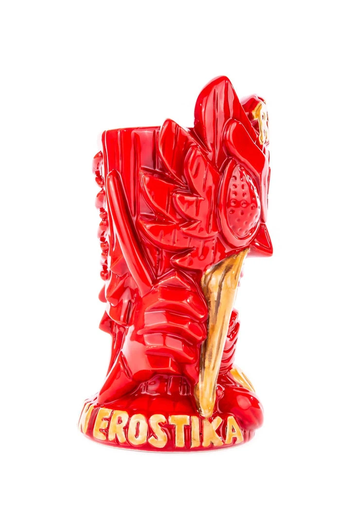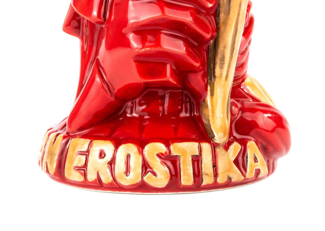 From Erostika and Rockin Jelly Bean comes the God Bird Man Tiki Mug, available in a red glaze with yellow highlights that is exclusive to Mondo! The mug was designed by RJB, and sculpted by Mad Sculptures Ware, it holds approximately 16oz, and is 7″. Edition of 250, with the 1st 100 being sold at Designer Con last year, now is your opportunity to grab what’s left in the edition size!