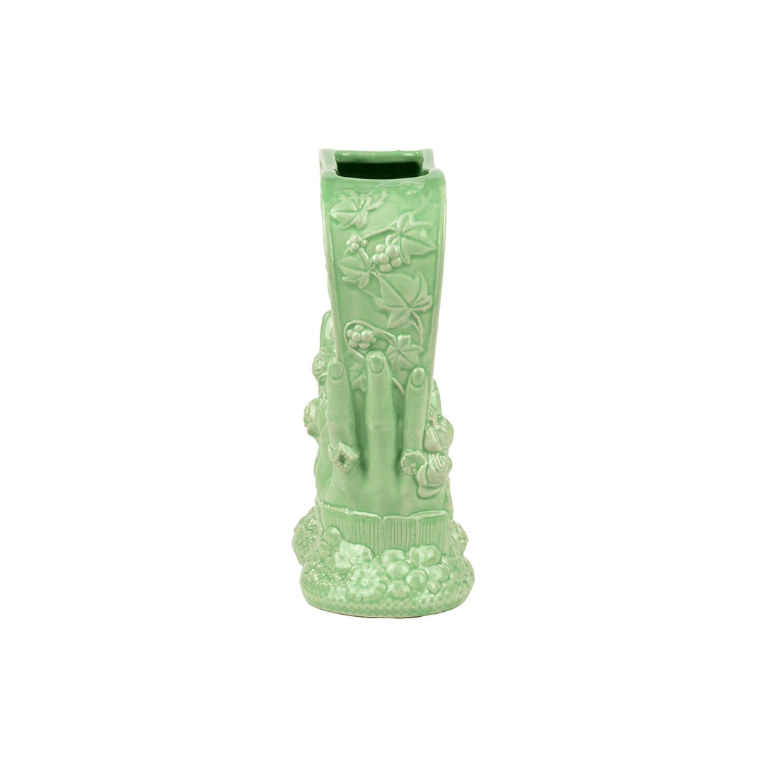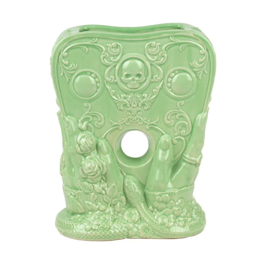 A blood-chillingly beautiful mix of ouija occultism and delicate Victorian darkness, Death’s Whisper fits just as well in your home bar as it does in your eternal resting place. It’s 8″ of smoothly sculpted stoneware ceramic available in this gorgeous gothic glazeway Seance by the Sea.