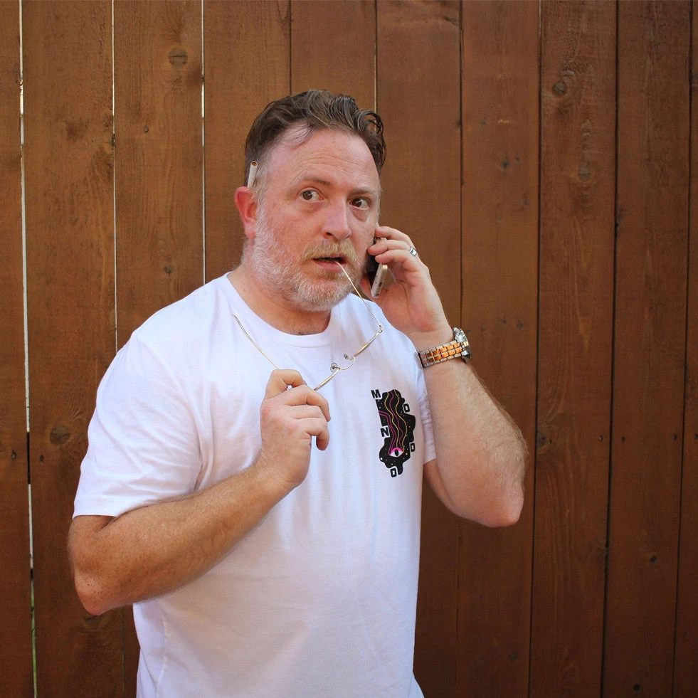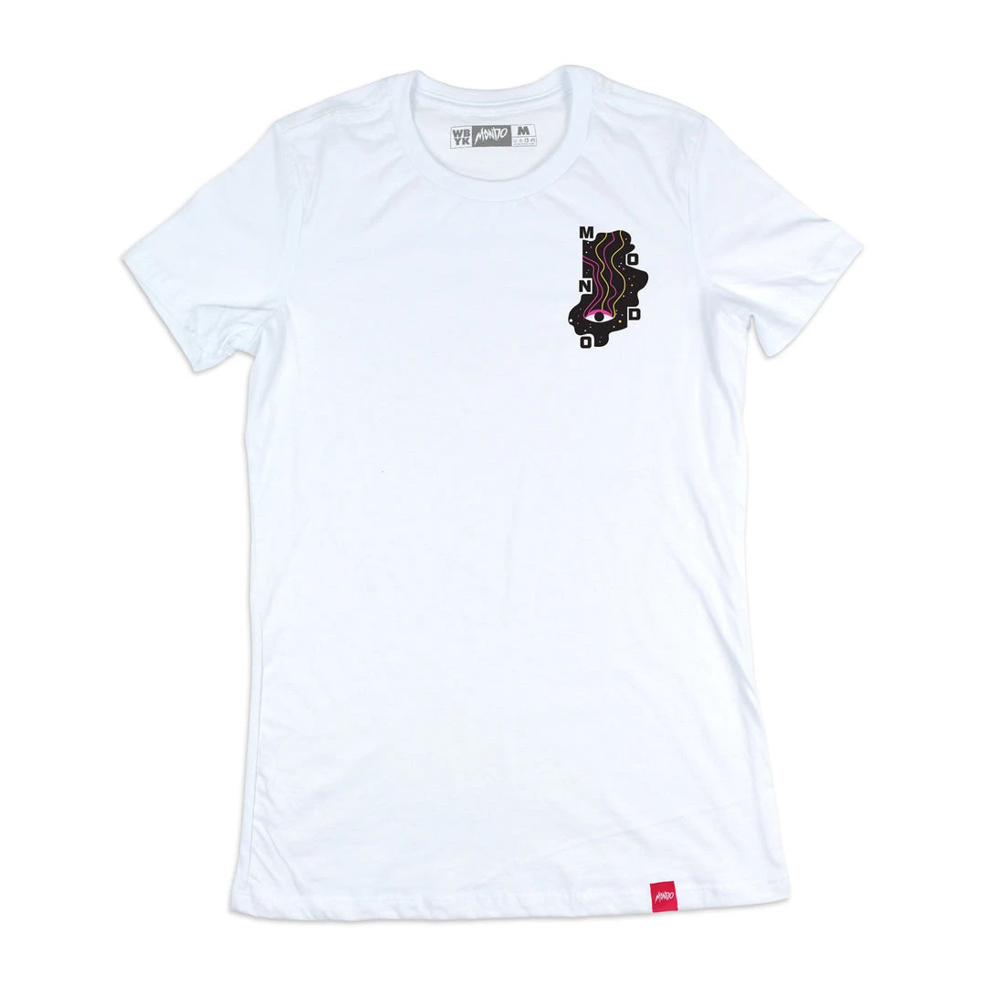 Screen printed by Industry Print Shop on a white t-shirt. Unisex shirts are available in sizes XS-4XL. 100% cotton shirt with red Mondo hem tag.